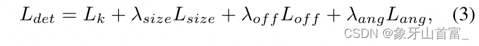与CenterNet相同,其中Lk、Lsize和Loff是中心点认知、尺度回归和偏移回归的损失;λsize,λoff和λang是常数因子,在实验中均设为0.1。
