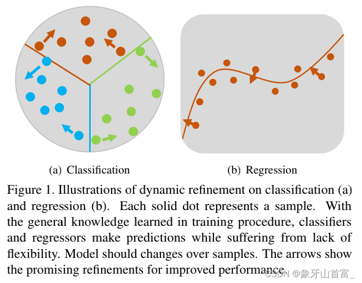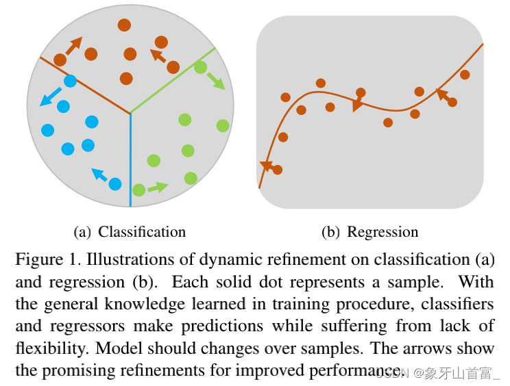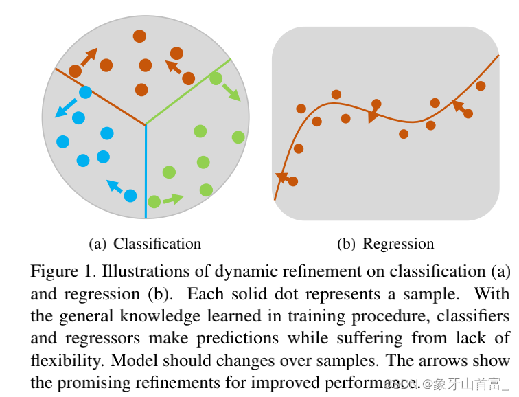 我们用一个三类分类问题的例子来说明我们的动机,如图1(a)中的左图所示。灰色圆形区域表示特征空间,实心点是属于三类的示例。一些样本距离判别边界较远,表明这些样本具有良好的语义判别能力。相比之下,边界边缘较小的样本不幸地与模型不太兼容。为了增强模型的灵活性,我们求助于对象感知分类/回归模块。