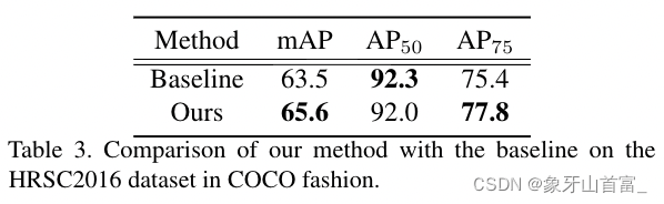 在表3中,我们以COCO格式进一步展示了评估结果。我们的方法提供1.9%的mAP增益。此外,随着IoU的增加,我们的方法也得到了改进。图7显示了使用我们的方法对DOTA和HRSC2016数据集的一些定性结果。