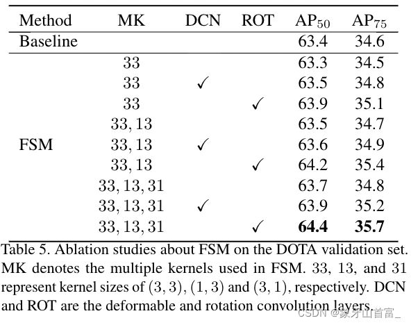 关于FSM在DOTA验证集上的消融研究.MK表示FSM中使用的多个卷积核,33、13和31分别表示(3,3)、(1,3)和(3,1)的卷积核大小。DCN和ROT是可变形的和旋转的卷积层