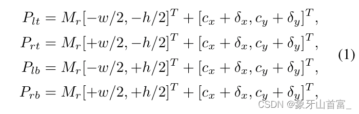 式中(cx, cy)和(δx, δy)为中心点和偏移预测;(w, h)为尺寸预测;Mr是旋转矩阵,plt,Prt,Plb和Prb是定向边界框的四个角点。在CenterNet的回归任务之后,我们使用L1损失来回归旋转角度 。