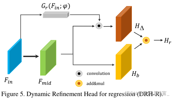 为了在不增加过拟合风险的情况下预测出准确值,我们设计了一个类似于图5中所示分类器的对象加权回归头。给定特征图Fin∈R(H×W×C),我们首先通过Gr(·;φ)计算动态过滤器权重Kr,然后预测类似于公式(10) 的细化因子H△来获得最终对象感知回归结果Hr: