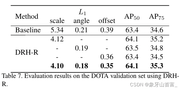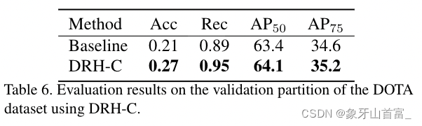 表6为DRH-C消融研究结果。DRH-C的引入大大提高了分类器的性能。Acc和Rec分别从0.21增加到0.32,0.81增加到0.89。对于检测,DHR-C提供ap50 0.7%和ap75 0.6%的增益。