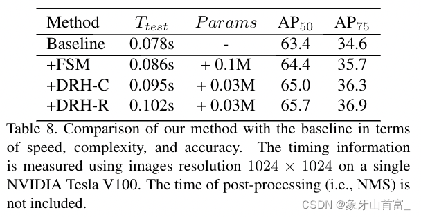 在速度、复杂度和准确度方面,将我们的方法与基线进行了比较。计时信息是在一台NVIDIA Tesla V100上使用1024×1024的图像分辨率测量的,不包括后处理时间(即NMS)