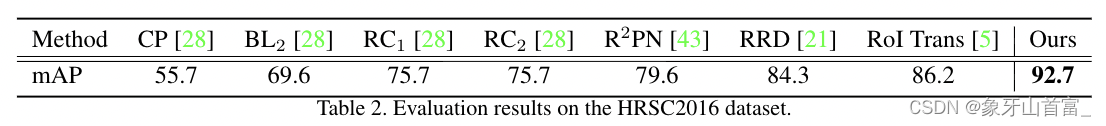 表2以Pascal格式显示了HRSC2016的结果。我们的方法在mAP方面获得了6.4%的显著增益。这种改进表明,所提出的FSM通过自适应调整感受野,有效地解决了错位问题。