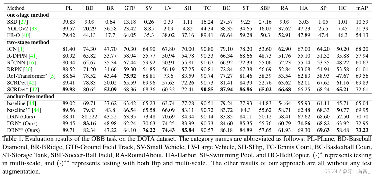 表1显示了在面向边界框(OBB)任务的DOTA测试集上将我们的方法与最先进的方法进行比较的定量结果。其他方法都是基于Anchor-based的,并且大多数都是基于Faster R-CNN的框架[35]。相比之下,我们遵循anchor-free范式并用SCRDet证明了比较的结果[42]。与基线相比,我们的方法在mAP方面取得了3.3%的显著进步。