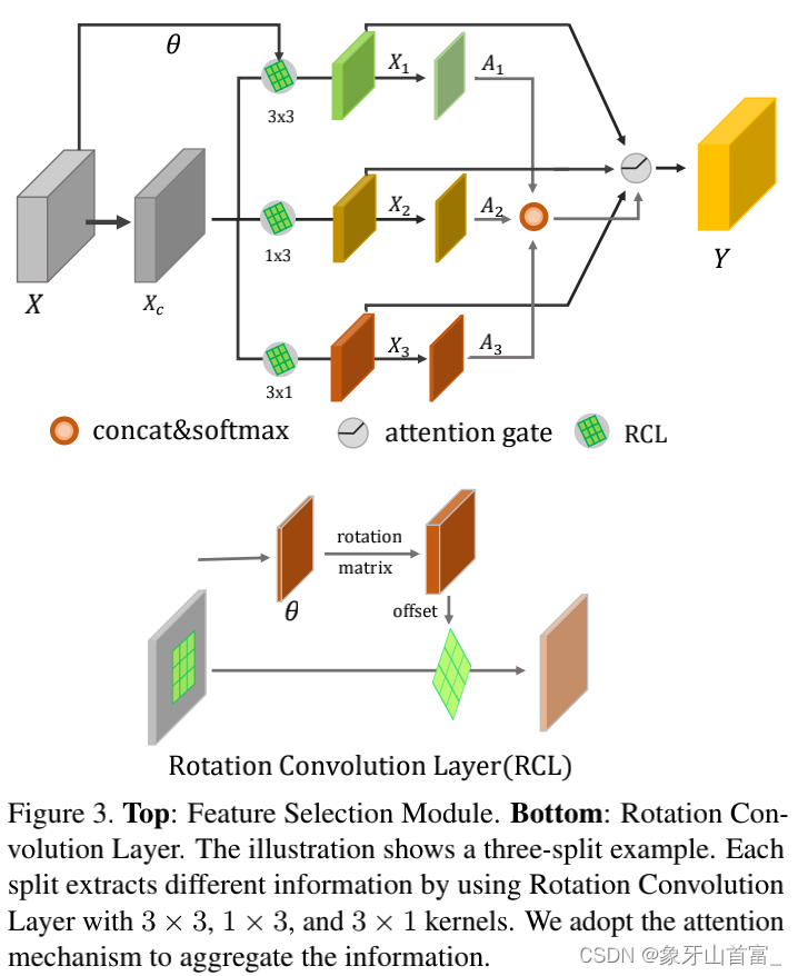 为了缓解各种对象和神经元的轴对齐感受野之间的不匹配,我们提出了一个特征选择模块(FSM)来自适应地聚合使用不同卷积核大小、形状(长宽比)和方向提取出来的信息(见图3)。