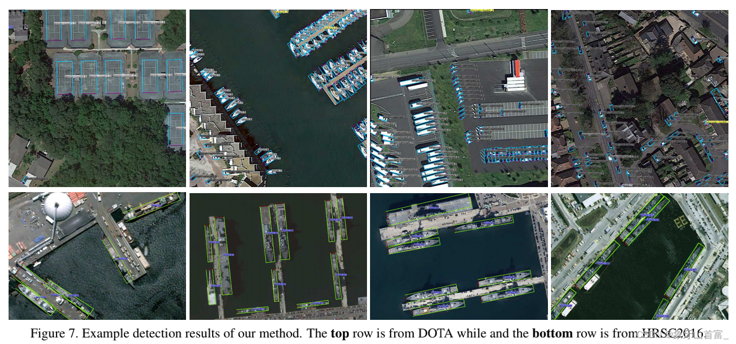 使用我们的方法的检测结果,上一行来自DOTA,下一行来自HRSC2016