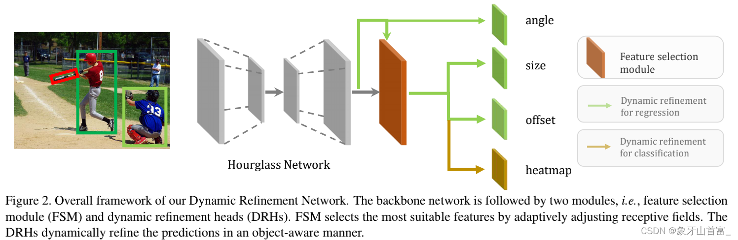 在这项工作中,我们采用了CenterNet[44],并以一个额外的角度预测头作为基线,提出了动态精细网络(DRN)。我们的DRN由两个新颖的部分组成:特征选择模块(FSM)和动态修正头(DRH)。FSM使神经元能够根据物体的形状和方向调整感受野,从而将精确的去噪特征传递给检测器。DRH使我们的模型能够以对象感知的方式进行灵活的推理。具体来说,我们提出了用于分类(DRH-C)和回归(DRH-R)任务的两个DRH。此外,我们还仔细研究了SKU110K[9]的面向标签的边界框,并将其命名为SKU110K-R;以这种方式,有助于面向对象的检测。为了评估提出的方法,我们在DOTA、HRSC2016和SKU110K数据集上进行了大量实验。