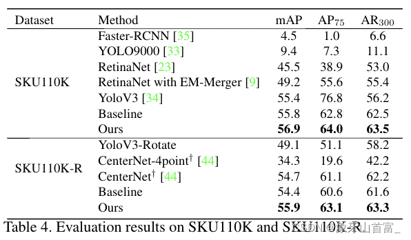 表4显示了SKU110K-R和SKU110K的结果。对于定向对象检测,我们通过引入角度预测重新实现了YoloV3[34]。CenterNet-4point表示对每个边界框的四个角进行回归,CenterNet表示我们将中心池化和DCN[4]添加到基线中。我们将mAP提高了1.5%,并在原始SKU110K数据集上报告了优异的结果。这些数字进一步证明了我们提出的DRN的有效性。