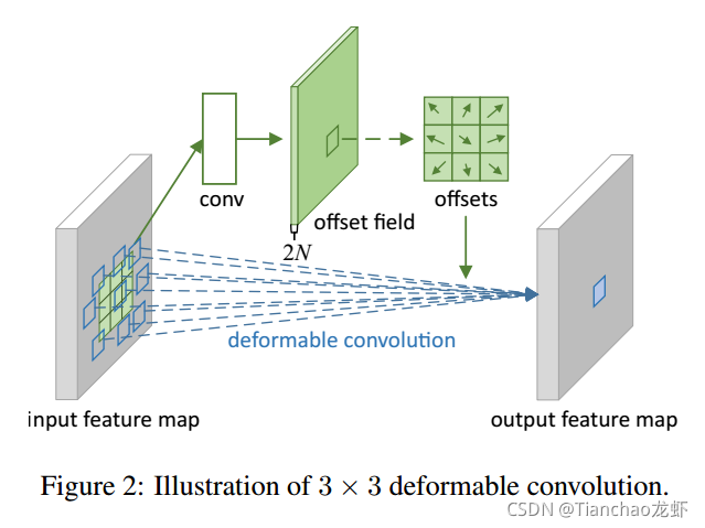 Deformable ConvNets模块不仅仅可以调整offsets来感知输入特征,而且还可以调整来自不同空间位置或者bins输入特征的幅度。也就是说modulation mechanism提供网络另一个维度来调整它空间支持区域。回顾一下deformable convnet v1的公式: