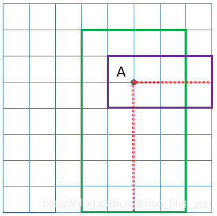 (2)如果原图(下图)一个格子表示8px,那么A距离紫色Bounding box边界的最大距离为24px,A距离绿色Bounding box边界的最大距离为40px,此时A距离不同box的最大距离都符合要求(0~64px),那么只能选择面积更小的紫色GT Bounding box作为A的回归目标
