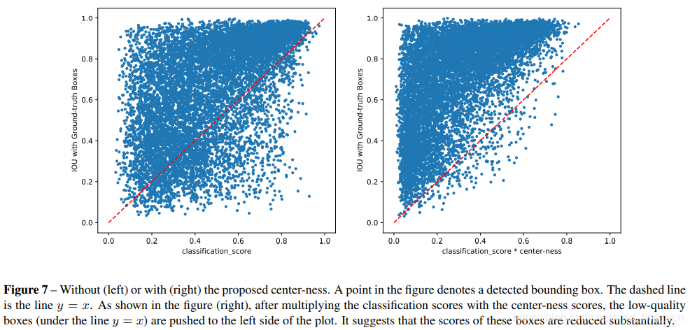 下图实验证明了,为传统classification_score加权求center-ness,并将两者相乘作为特征点的新的置信度是有意义的。简单解释一下,如右图所示,新置信度越高,它对应预测出来的box和GT Bounding box的IOU越高,这说明筛选后的预测box质量可以!可以发现新置信度和IOU成正比关系。