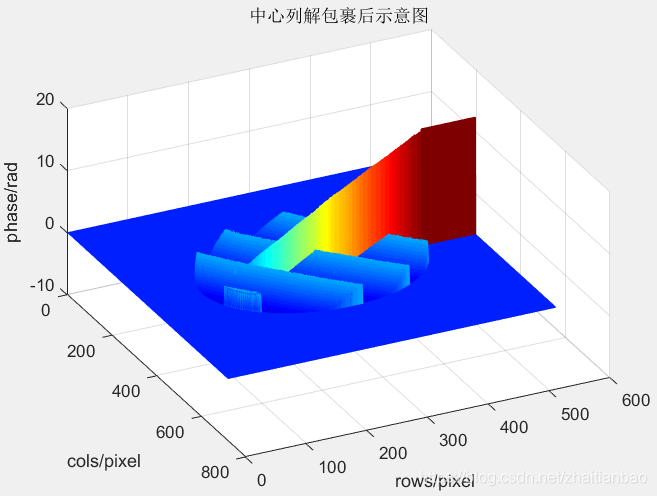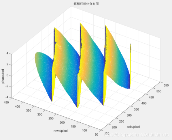 - 之后,以中心列上的相位数据为起点,分别对每个点的左右两侧的行数据进行解包裹操作,最终可实现全图相位信息的解缠,效果图如图4所示。