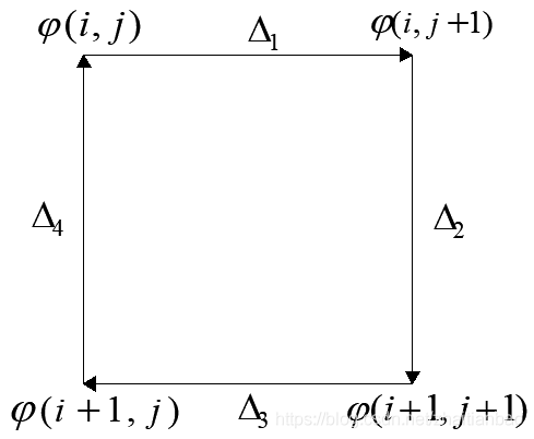 , 该值处于(-π,π)区间中;定义一个2×2大小的残差点判断窗口,如图6所示,沿顺时针方向计算相邻相位的差值,当差值超过(-π,π)区间时,对其进行缠绕操作W(对该值加减2π,确保其回归到单周期内),用