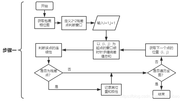 1)判定包裹相位图中残差点位置。设第i行第j列的包裹相位为