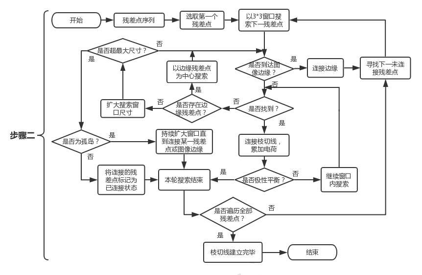 第一轮结束后,所有连接过的残差点无论整体是否平衡,均标记为已连接状态,若某点在整轮过程中没有任何一个残差点可以与其连接,则继续扩大搜索尺寸直到找到一个可以连接的点(不论正负)并连接,可有效避免某些残差点的遗漏现象发生;再以第二个未连接过的残差点为中心开启下一轮搜索,只搜索未连接过的残差点,以此类推直到全图残差点均被连接完毕,此时相位图的枝切线构建完毕。