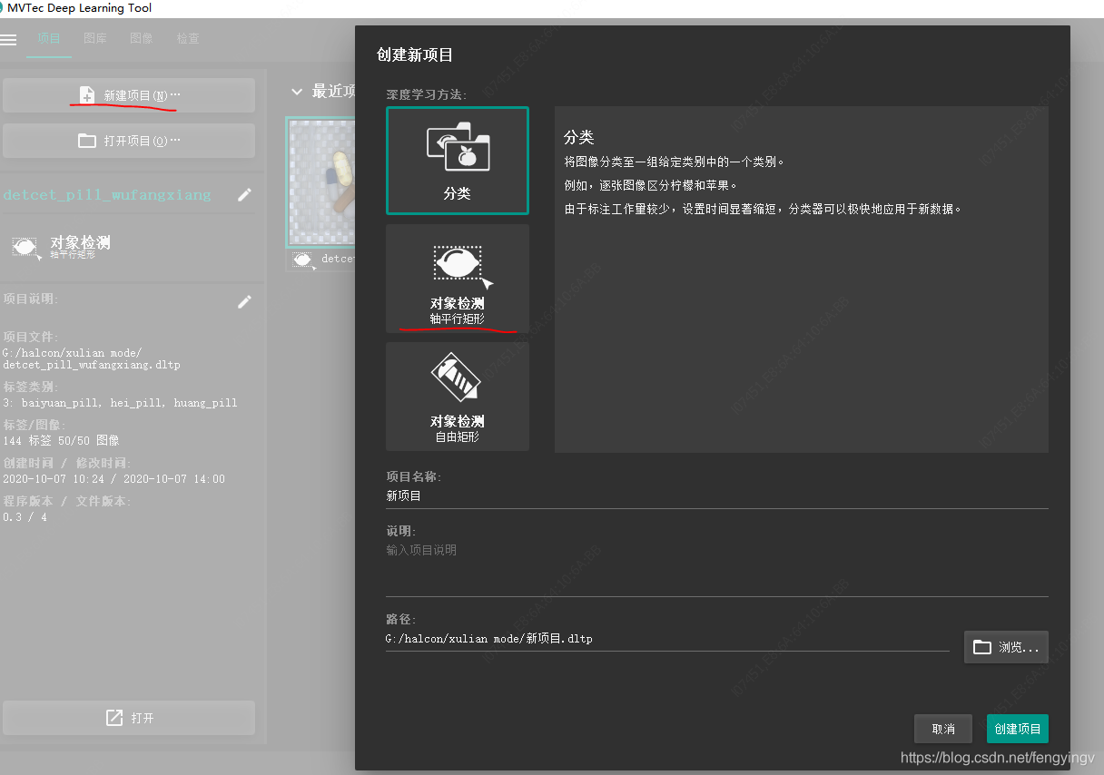 根据自己的项目建立完项目后,这里我用第二个演示(对象检测,轴平行矩形),填写下面的项目名称及路径,切记,项目名称和路径不能出现中文;