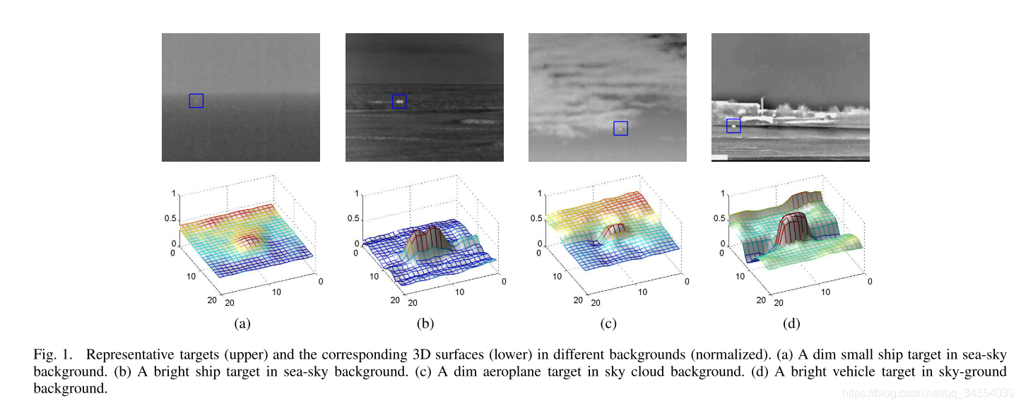 在实际的图像序列中,目标的灰度分布并不总是满足二维高斯分布,例如文章中列举了一些目标具有"flat top" shape, 如图1,且由于受成像距离、环境、目标类型的影响,目标的大小在2*2~10*10不等,目标的灰度峰值也很离散。(目标3D灰度分布图见附录1)