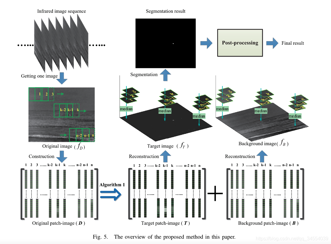 - 算法依据:背景主要是大面积缓慢变化的低频部分,如自然背景中的云层,其在空间上往往呈大面积的连续分布状态,在红外辐射的强度上也呈渐变过渡状态,使得其在灰度空间分布上具有较大相关性,这也是为什么我们在对背景预测时需要重点考虑背景辐射强度的起伏。本文提到,即使是图像中不相邻的背景之间也存在较强的相关性,因此可以将背景图B看作低秩矩阵。