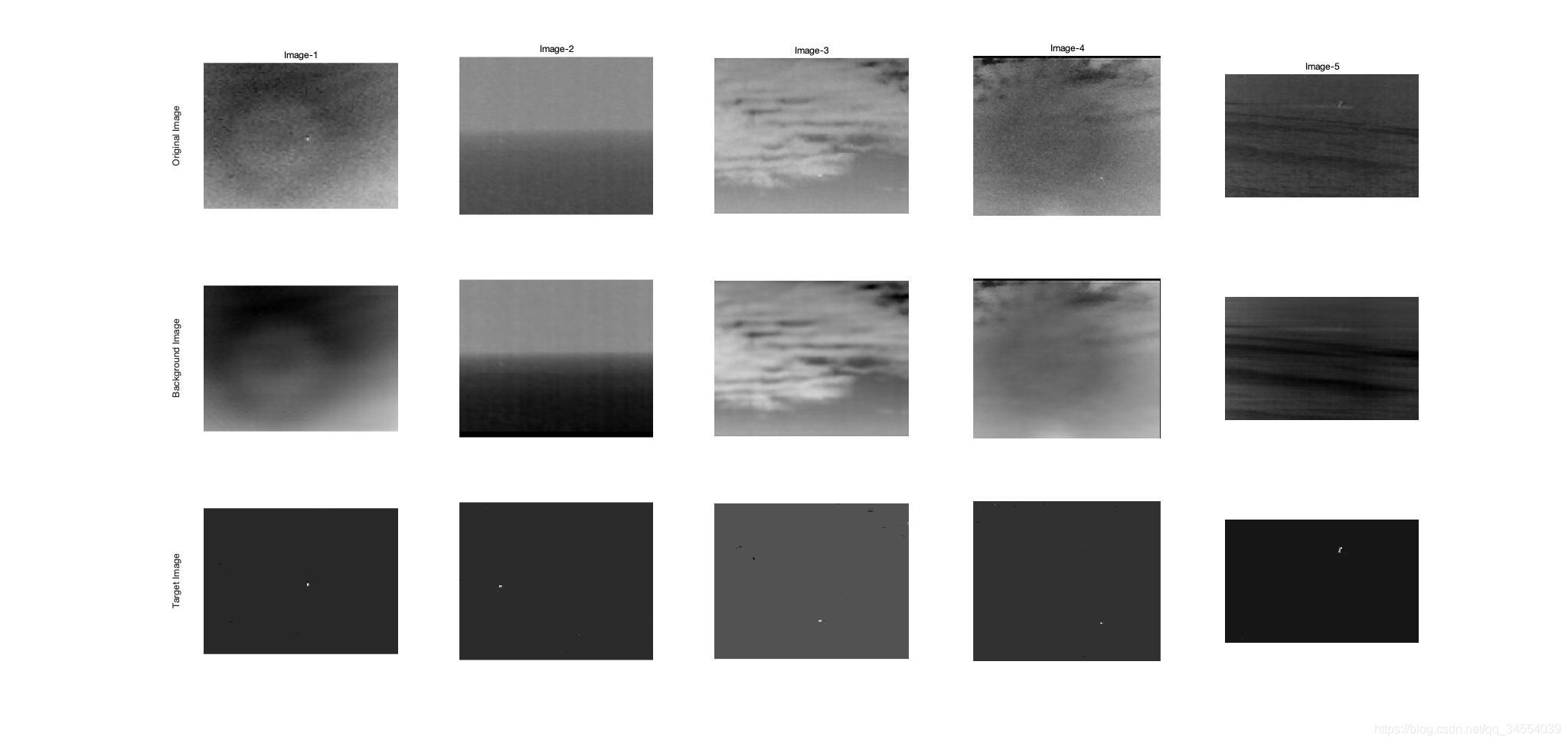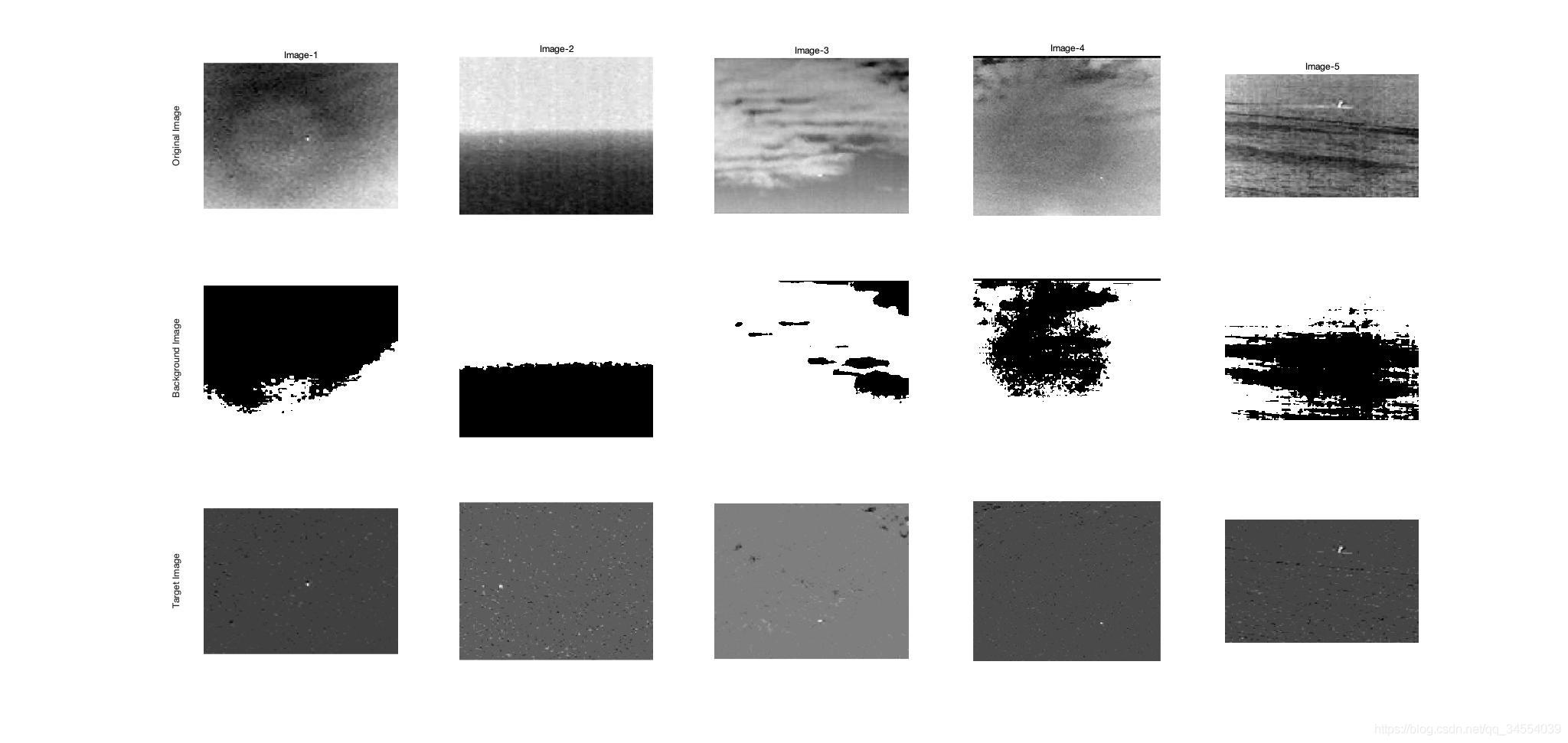 学习到这里,笔者也对该算法进行了分解和尝试:本文算法的时间主要用在了patch-image的构造与重构,使用相同的图像,构造与不构造patch-image的时间相差接近10倍。如果不构造patch-image ,直接使用APG_IR分解原图像,结果如下:不构造patch-image,直接使用APG在原图上做低秩、稀疏矩阵的恢复,处理5张图共耗时1.48s,从结果看很不理想,背景结果不理想,但得到的目标图背景相比之前似乎变纯净了,减少了很多边缘噪声,背景更加平滑。