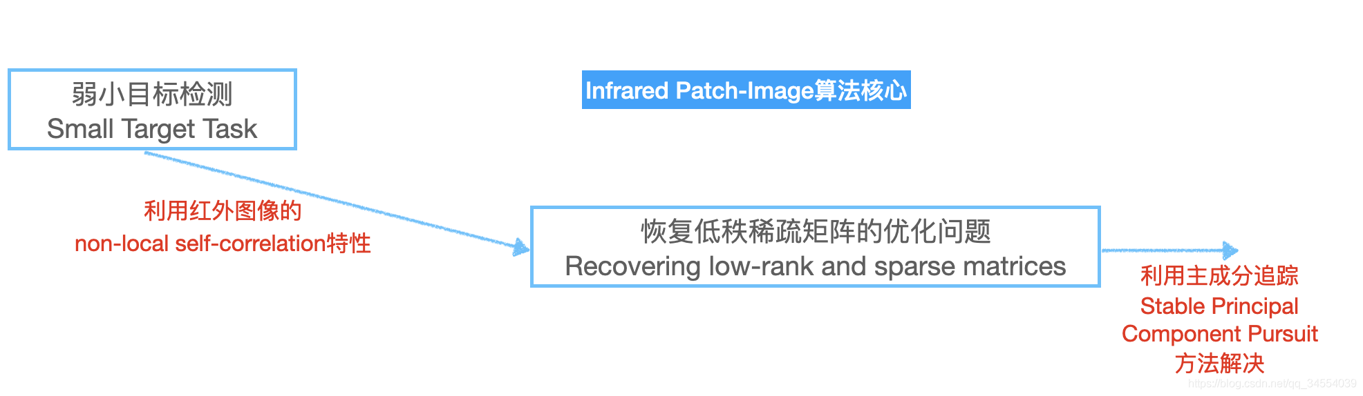 - 基于新模型,假设目标图T为稀疏矩阵,背景图B为低秩矩阵,进而将目标检测转化为分离低秩矩阵与稀疏矩阵的优化问题;