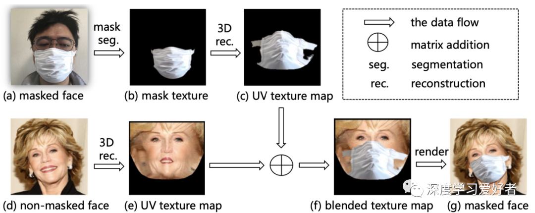 FMA-3D:给定一个真正的戴面具的脸图像(图2 (a))和B non-masked脸图像(图2 (d)),作者合成一个写实的戴面具的脸图像的面具和面部区域B。首先,作者利用一个面具分割模型[23]从图像中提取面具区域(图2 (B)),然后映射纹理映射到UV空间真实感三维人脸重建方法PRNet[12](图2 (c))。对于图像B,作者采用与A相同的方法计算UV空间中的纹理贴图(图2(e))。接下来,作者在UV空间中混合蒙版纹理贴图和人脸纹理贴图,如图2(f)所示。最后,根据图像b的UV位置图绘制混合纹理图,合成出蒙面图像(图2(g))。图3为FMA-3D合成的更多蒙面图像。与基于2d和基于gan的方法相比,作者的方法在鲁棒性和保真性方面表现出了优异的性能,特别是对于大的头部姿态。