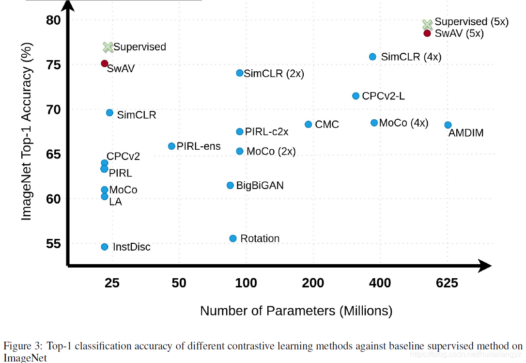 早期工作将一些实例级的分类任务作为前置任务,最近的工作(SwAV、MoCo、SimCLR)使用一些改进的方法,取得了和SOTA的有监督方法相似的性能