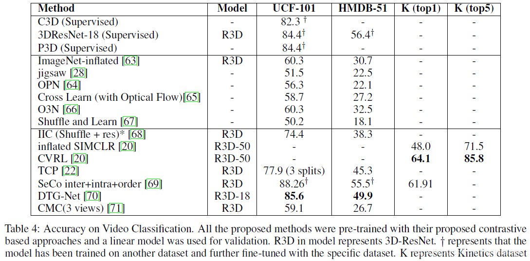 视频分类:先在数据集上进行预训练,然后使用一个线性分类器进行finetune后进行评估