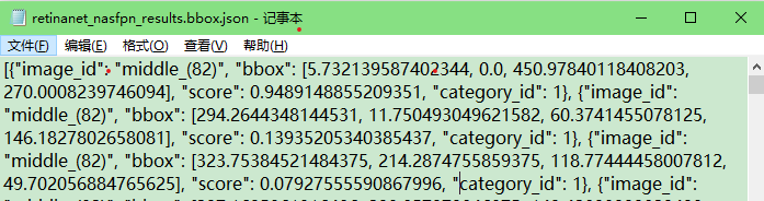 此格式文件中含有image_id, bbox, score 和 category_id 四类信息。