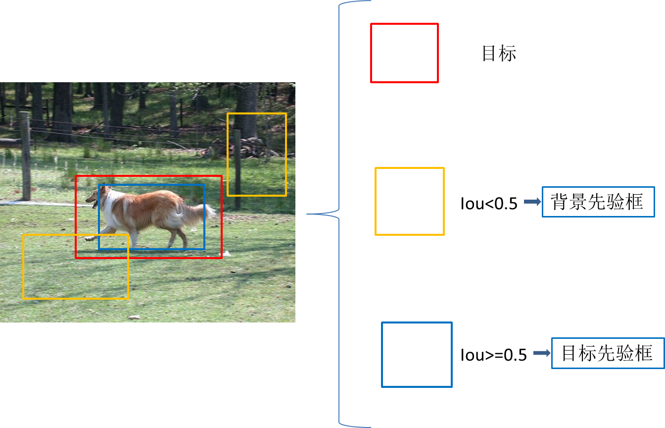 我们的做法是,设定一个IoU阈值,例如iou=0.5,与图片中目标的iou<0.5的先验框,这些框我们将其划分为背景,Iou>=0.5的被归到目标先验框,通过这样划分,得到供模型学习的ground truth信息,如图