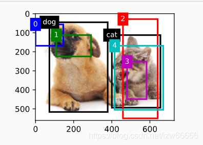 我们根据锚框与真实边界框在图像中的位置来分析这些标注的类别。首先,在所有的“锚框—真实边界框”的配对中,锚框\(A_4\)与猫的真实边界框的交并比最大,因此锚框\(A_4\)的类别标注为猫。不考虑锚框\(A_4\)或猫的真实边界框,在剩余的“锚框—真实边界框”的配对中,最大交并比的配对为锚框\(A_1\)和狗的真实边界框,因此锚框\(A_1\)的类别标注为狗。接下来遍历未标注的剩余3个锚框:与锚框\(A_0\)交并比最大的真实边界框的类别为狗,但交并比小于阈值(默认为0.5),因此类别标注为背景;与锚框\(A_2\)交并比最大的真实边界框的类别为猫,且交并比大于阈值,因此类别标注为猫;与锚框\(A_3\)交并比最大的真实边界框的类别为猫,但交并比小于阈值,因此类别标注为背景。