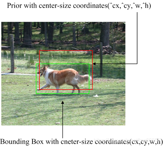 对于一只狗的目标边界框和先验框的示例如下图所示: