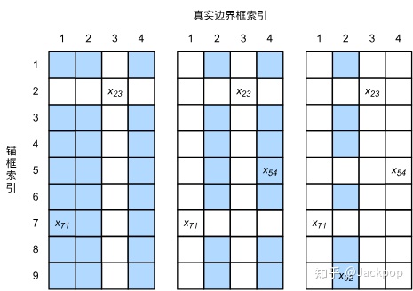 假设图像中有 个anchor box,有 个真实边界框,这样的话就形成了一个anchor box与真实边界框之间的对应关系矩阵 ,那么就根据这个对应关系找出与每个anchor box交并比最大的真实边界框,然后真实边界框的标签作为anchor box的标签,然后计算anchor box相对于真实边界框的偏移量。