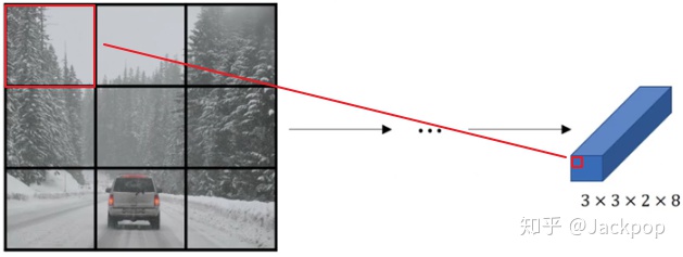 在经过一系列卷积和池化之后,在feature map层使用anchor box,如上图所示,经过一系列的特征提取,最后针对 的网格会得到一个 的特征层,其中2是anchor box的个数,以《deep learning》课程为例选择两个anchor box,8代表每个anchor box包含的变量数,分别是4个位置偏移量、3个类别(one-hot标注方式)、1个anchor box标注(如果anchor box与真实边框的交并比最大则为1,否则为0)。