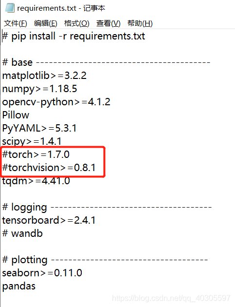 1.2 下载完成后,打开文件夹中的 requirements.txt,将torch和torchvision这两行前面加#注释掉,这两行是给cpu版本安装的。