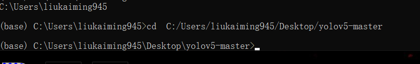 例如:cd C:/Users/liukaiming945/Desktop/yolov5-master(如下图)