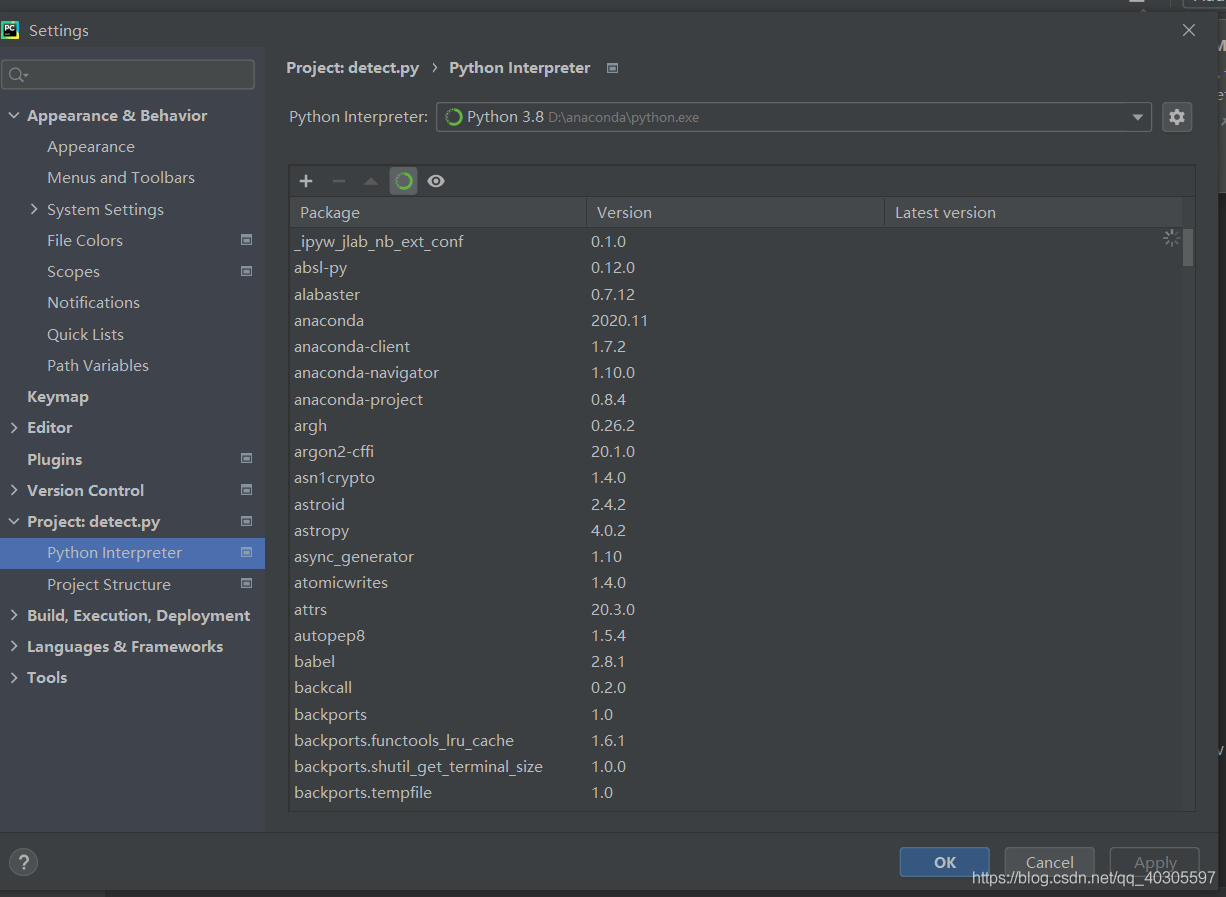 先查看一下解释器配好了没:File-Settings-Project-Python interpreter(配好了如下图所示,没配好的话重新打开一次试试,目前小白只知道这个方式):