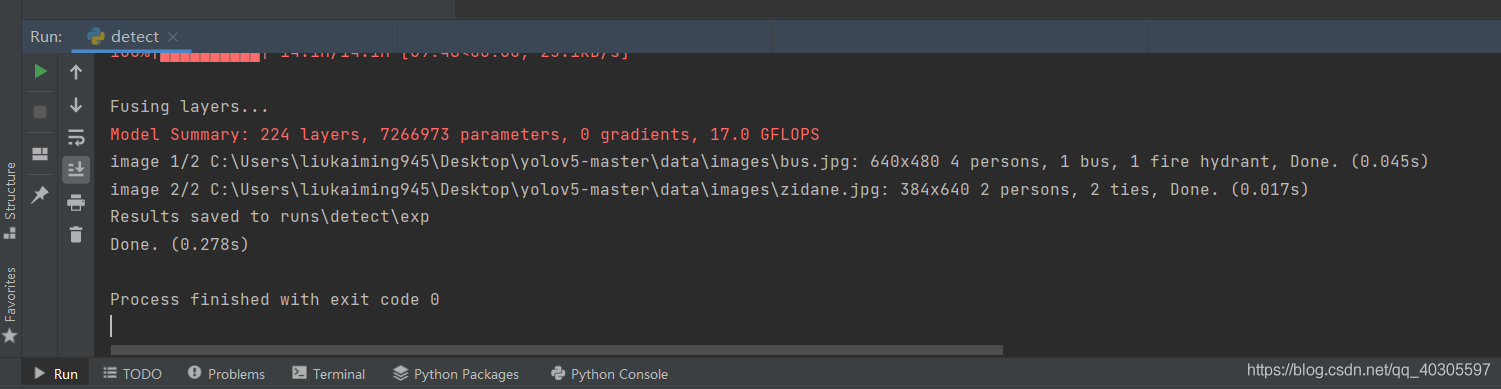 测试照片在data/images,检测结果在runs/detect/exp。 可以多放几张进去,测试一下效果,顺便夸夸自己,虽然自己工作量甚微,第一次运行成功(返回0为运行成功 返回1就~~~~~)