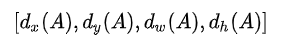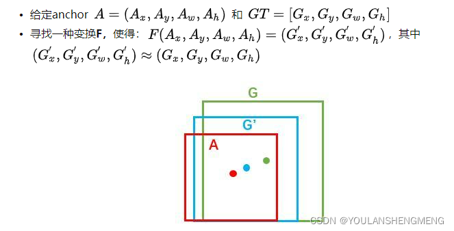 对于窗口一般使用四维向量 (x,y,w,h) 表示,分别表示窗口的中心点坐标和宽高。对于下图,红色的框A代表原始的positive Anchors,绿色的框G代表目标的GT,我们的目标是寻找一种关系,使得输入原始的anchor A经过映射得到一个跟真实窗口G更接近的回归窗口G',即: