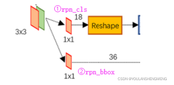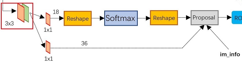 经过该卷积的输出图像为WxHx18大小。这也就刚好对应了feature maps每一个点都有9个anchors,同时每个anchors又有可能是positive和negative,所有这些信息都保存WxHx(9*2)大小的矩阵。为何这样做?后面接softmax分类获得positive anchors,也就相当于初步提取了检测目标候选区域box(一般认为目标在positive anchors中)。那么为何要在softmax前后都接一个reshape layer?其实只是为了便于softmax分类,单独“腾空”出来一个维度以便softmax分类,之后再reshape回复原状。