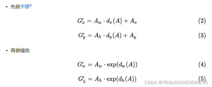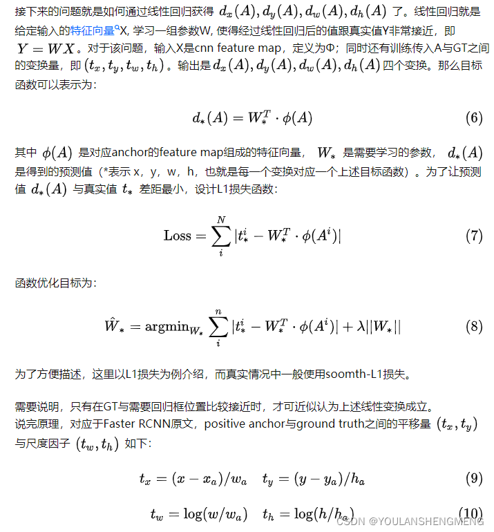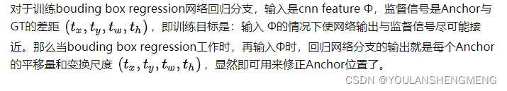 这四个变换。当输入的anchor A与GT相差较小时,可以认为这种变换是一种线性变换, 那么就可以用线性回归来建模对窗口进行微调(注意,只有当anchors A和GT比较接近时,才能使用线性回归模型,否则就是复杂的非线性问题了)。