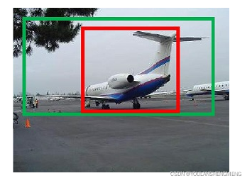 下图所示绿色框为飞机的Ground Truth(GT),红色为提取的positive anchors,即便红色的框被分类器识别为飞机,但是由于红色的框定位不准,这张图相当于没有正确的检测出飞机。所以我们希望采用一种方法对红色的框进行微调,使得positive anchors和GT更加接近。