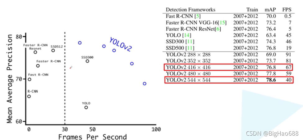 在原论文当中,使用pascal voc 2007数据集以及imagent数据集联合训练,最后能检测的类别超过9000,所以原论文名叫作YOLO9000。yolov2相比于yolov1,变强大了很多。