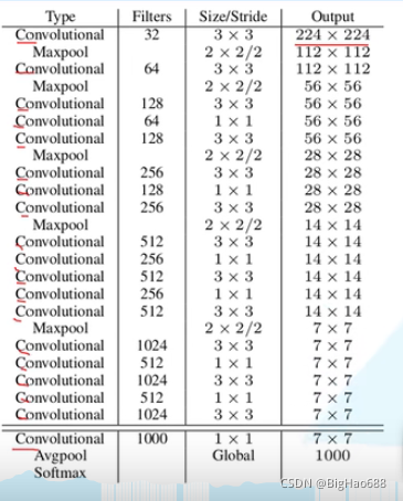 在YOLOv2中使用的主干网络是Darknet-19(使用了19个卷积层),下图是该网络结构的配置: