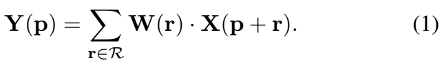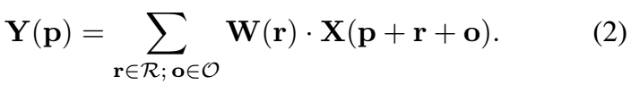 其中W表示卷积核的参数,R为{(-1,-1),(-1,0),..., (0,1),(1,1)}表示参与卷积的像素相对于当前空间位置的偏移,p表示当前卷积所在的空间位置。