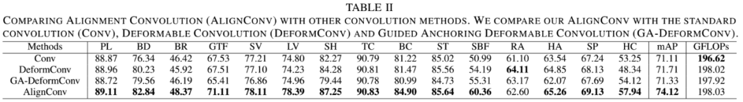 下图是各种卷积的对比,a是常规卷积,b是可变形卷积,c和d是对齐卷积的2个例子,分别对应于水平和旋转矩形框。对于可变形卷积来说,由于监督信号弱,可能会采样到错误的点上去,对齐卷积使用anchor框做指导,提取的是网格状分布的特征,和可变形卷积的不同点在于对齐卷积的偏移量是直接从anchor框中推理得到的。