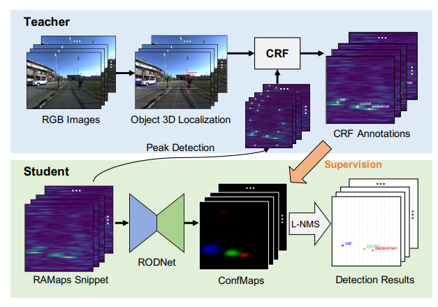 提出一种全新的雷达目标检测网络:RODNet,无需摄像头或激光雷达情况下,用在各种驾驶场景下进行鲁棒的目标检测。一个摄像机-雷达融合(CRF)跨模态监管框架,用于训练 RODNet,无需繁琐且可能不一致的人为标注。