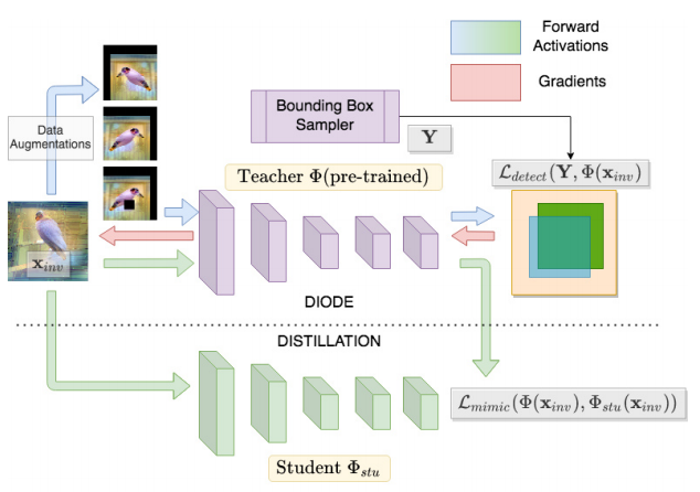 用于目标检测的无数据知识蒸馏技术,由两部分组成:DIODE,通过模型逆映射从预训练检测模型中合成图像的框架;一个无数据模仿学习方法,对从老师对学生合成的图像进行知识蒸馏,用于目标检测。
