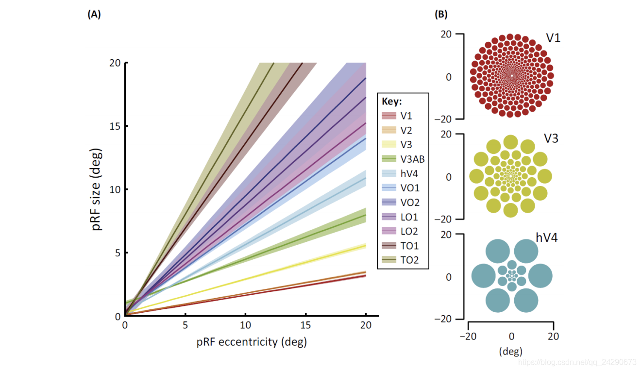 群智感受野(pRF)属性的规律。 (A)pRF大小可以看作人类视网膜图中偏心率的函数,其中两个趋势是明显的:(1)pRF大小随着每个图中的偏心率而增加,以及(2)图之间的pRF大小有差异。 (B)基于(A)中的参数的pRF的空间阵列:每个圆的半径是在适当的偏心率下的表观RF尺寸。
